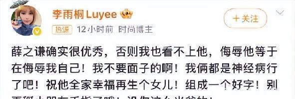 原本以为薛之谦工作室一出来澄清,李雨桐就会静一静,不再嚣张。毕竟,这像是那些爆料一出来,大家必然会走的一套流程。不过李雨桐没按常理出牌,反倒又发了一条微博,感觉像是在暗示薛之谦。