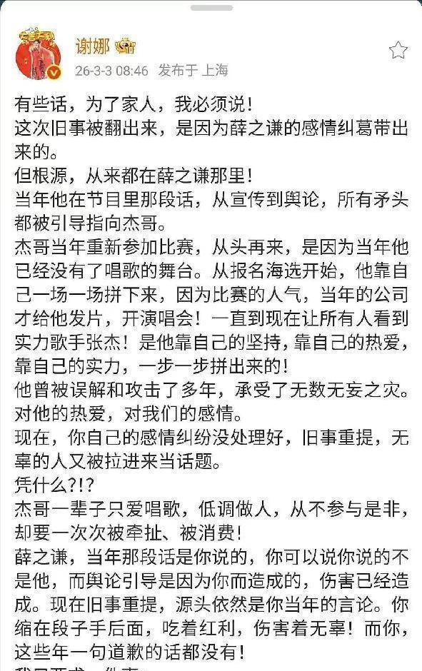 这次因为李雨桐的话题,张杰的事又一次被人们提起了。就在这个时候,谢娜作为张杰的老婆,直接发了一篇长篇文章,为老公撑腰,替他抱不平。她还向薛之谦发去了声,告诉他要对之前说的话负起责任。